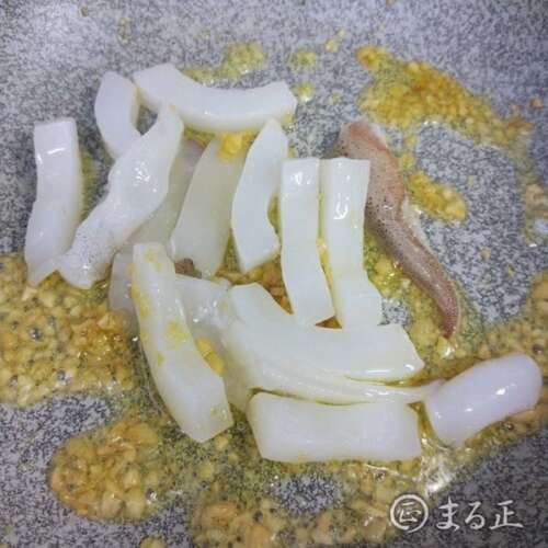 フライパンにオリーブオイルと刻んだニンニクを炒め、ニンニクの香りが立ってきたらイカの切り身を加えて30秒程炒めます。